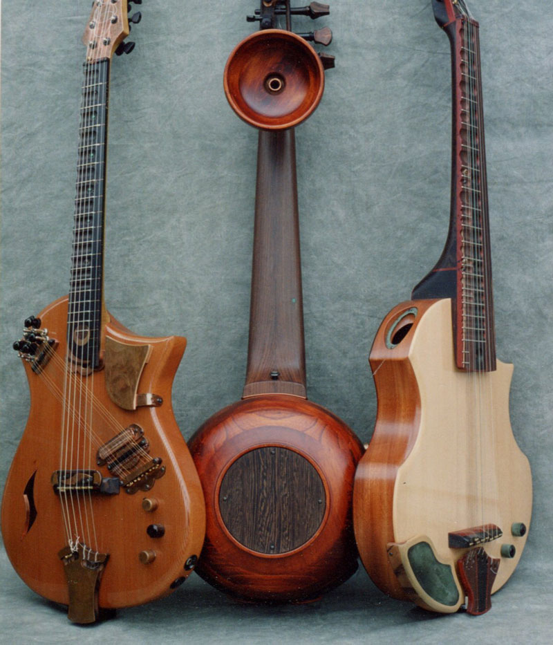 Pictured left to right- Sitari, Orientari and Sadari : three examples of fretted/fretless hybrids. SPECIAL NOTE for those interested : Each hybrid instrument built by Ari Lehtela is a one-of-a-kind. The instruments shown in the photo show 3 examples of a single neck Hybrid. The Ari Lehtela Hybrid may be single or double neck, based on one of his models or custom built to include design ideas from the customer. Options available can include items such as a range of scale length/tuning center options, type of neck ( solid vs hollow ), single neck or double neck, ” microtonal ” partials, fixed or movable frets in addition to various other options